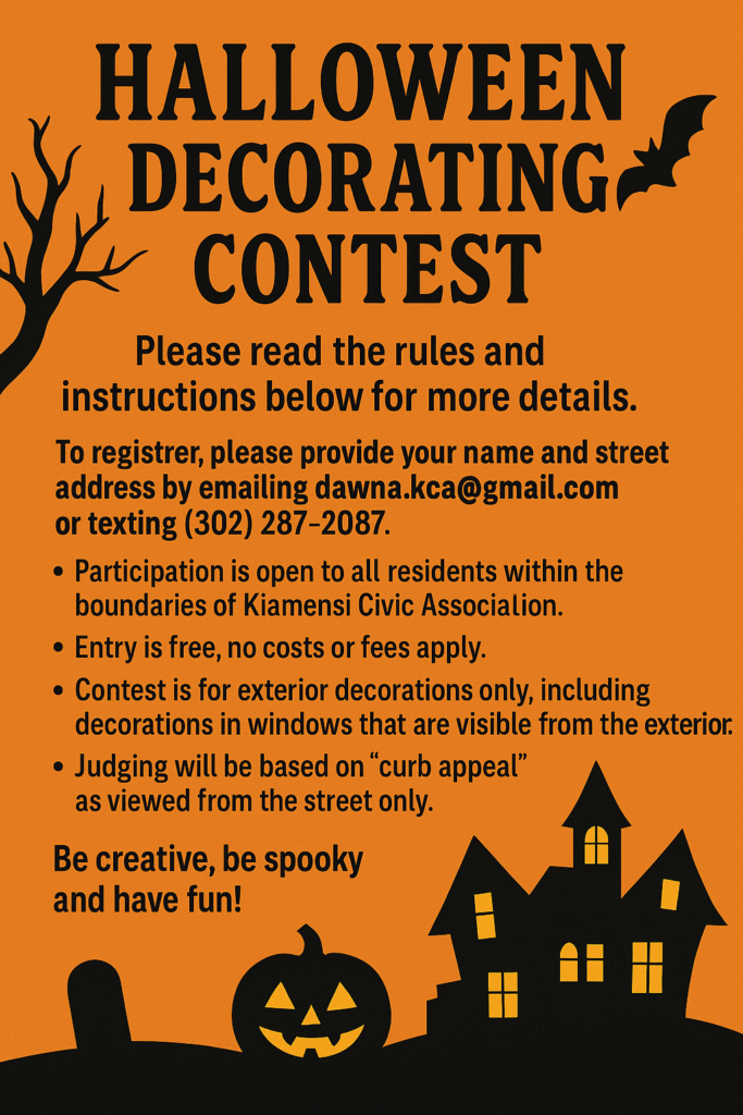 Halloween is just around the corner, and Kiamensi Civic Association is excited to invite all residents to take part in our Halloween Decorating Contest! Whether you love spooky skeletons, glowing pumpkins, or creative haunted house vibes, now’s your chance to show off your Halloween spirit.
